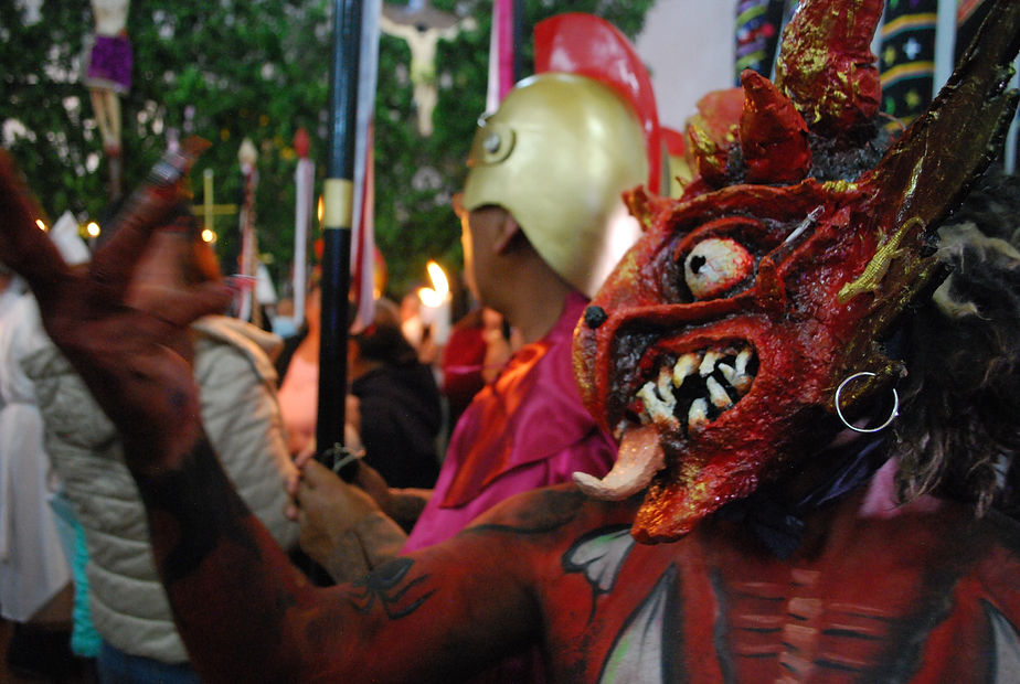 El grupo más característico de la parroquia. Los atuendos incluyen una careta con cachos de animales tenebrosos, una capa roja o negra, espuelas, zapatos de cuero y un tridente que simboliza las 3 cabezas del Diablo: Judas, Caifás y Pilatos.